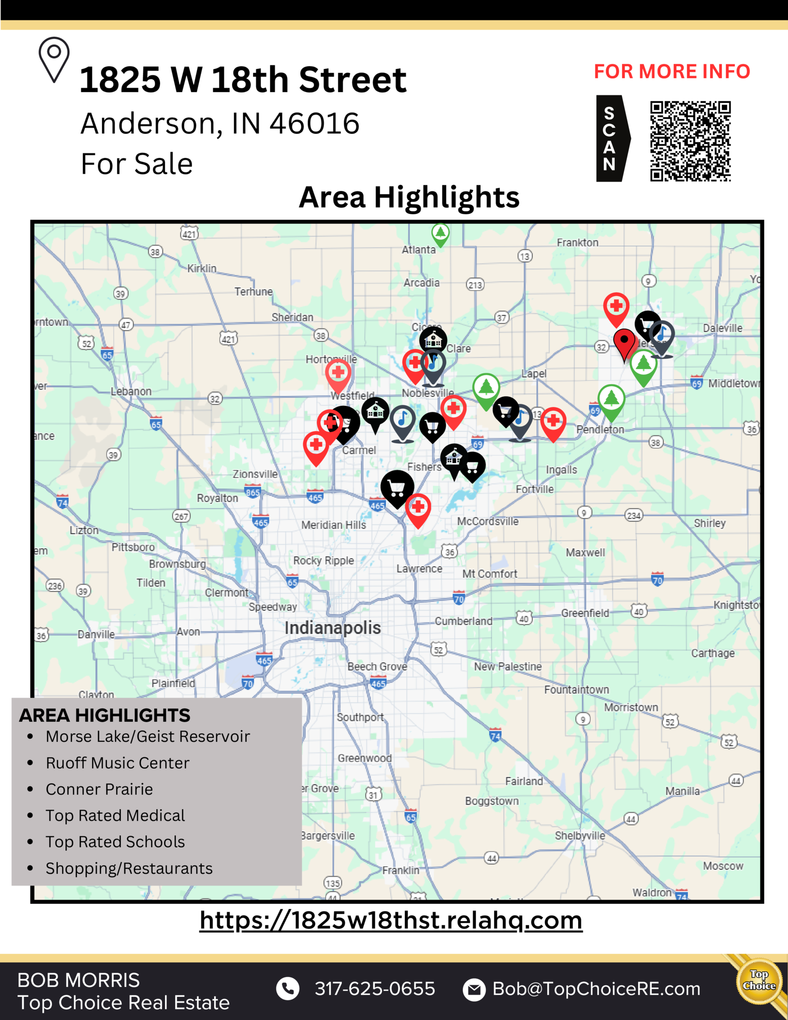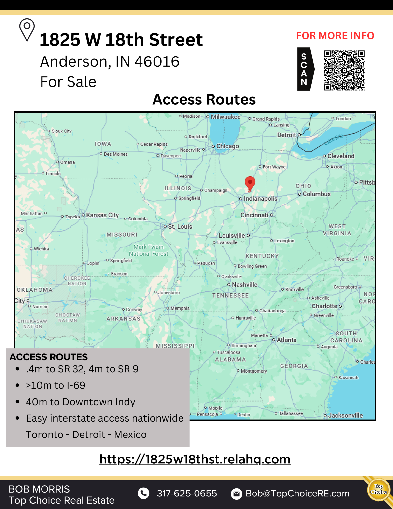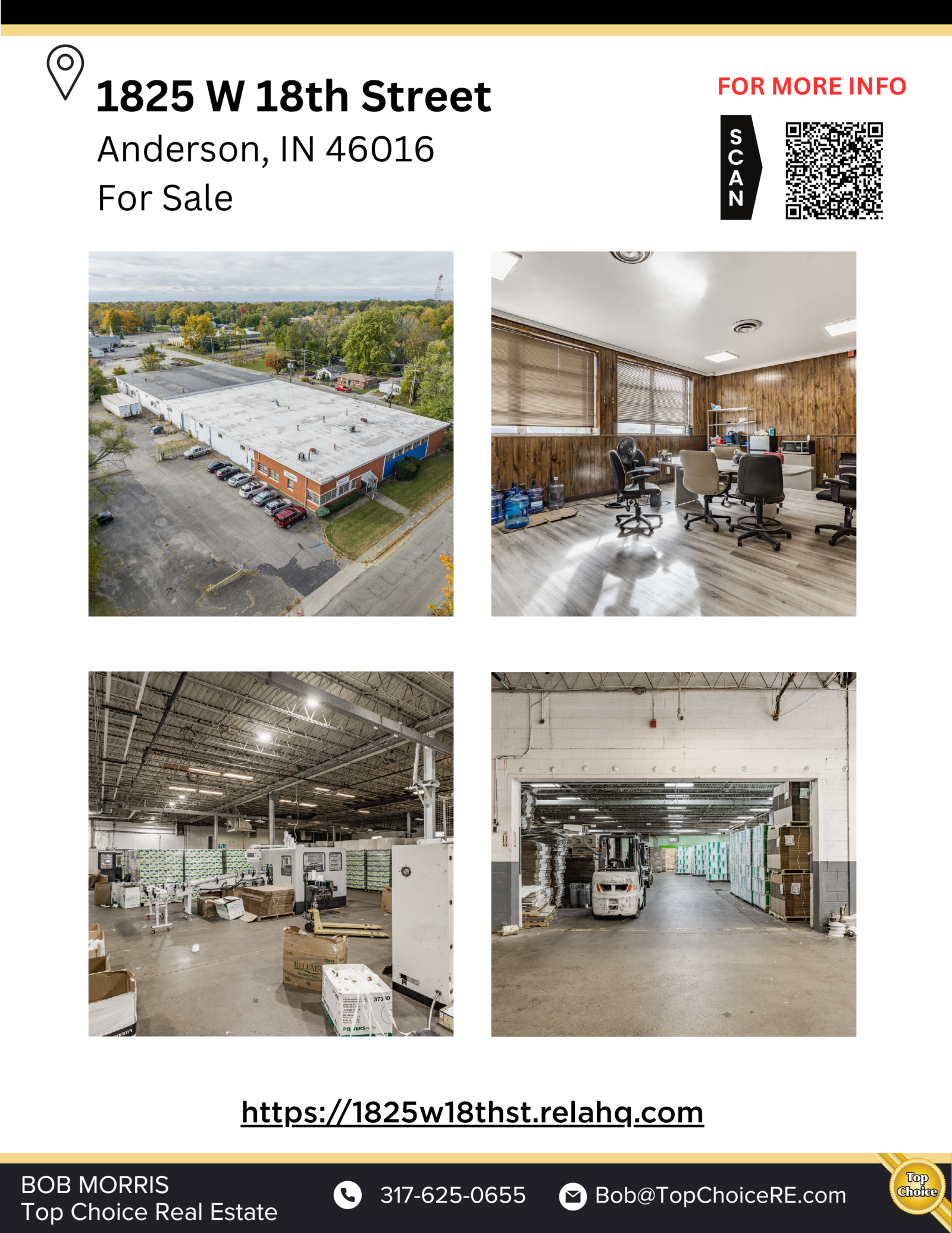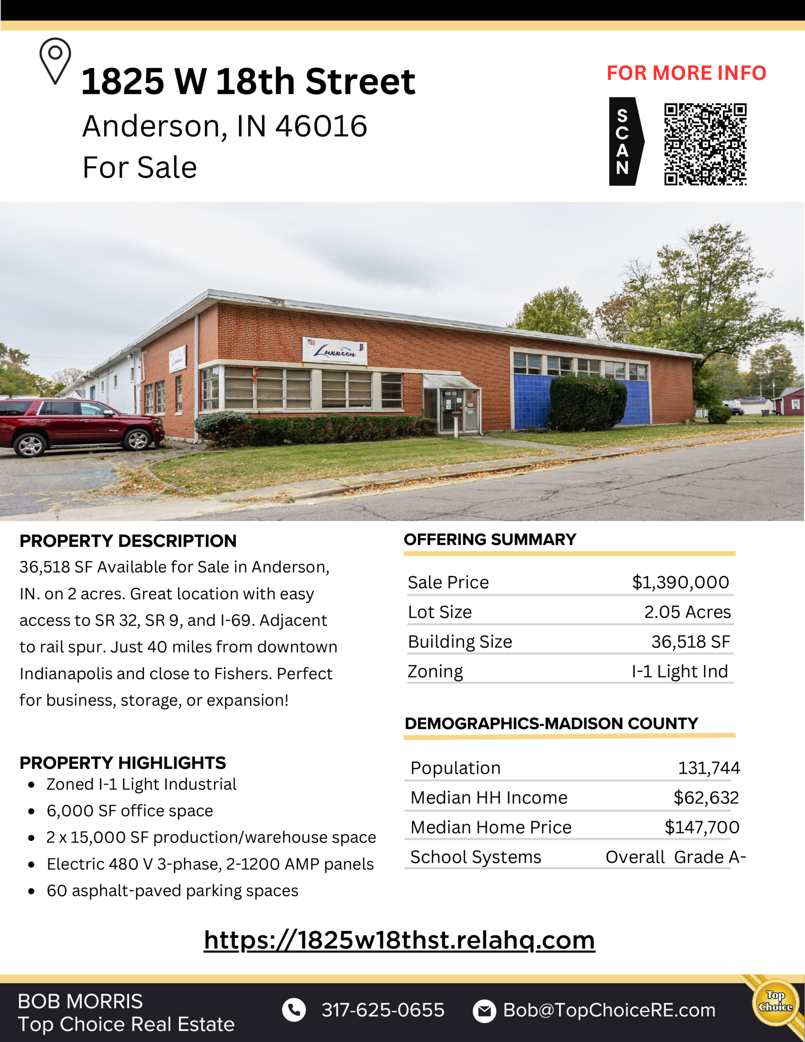 36,518 SF Available for Sale in Anderson, IN. on 2 acres. Great location with easy access to SR 32, SR 9, and I-69. Adjacent to rail spur. Just 40 miles from downtown Indianapolis and close to Fishers. Perfect for business, storage, or expansion!