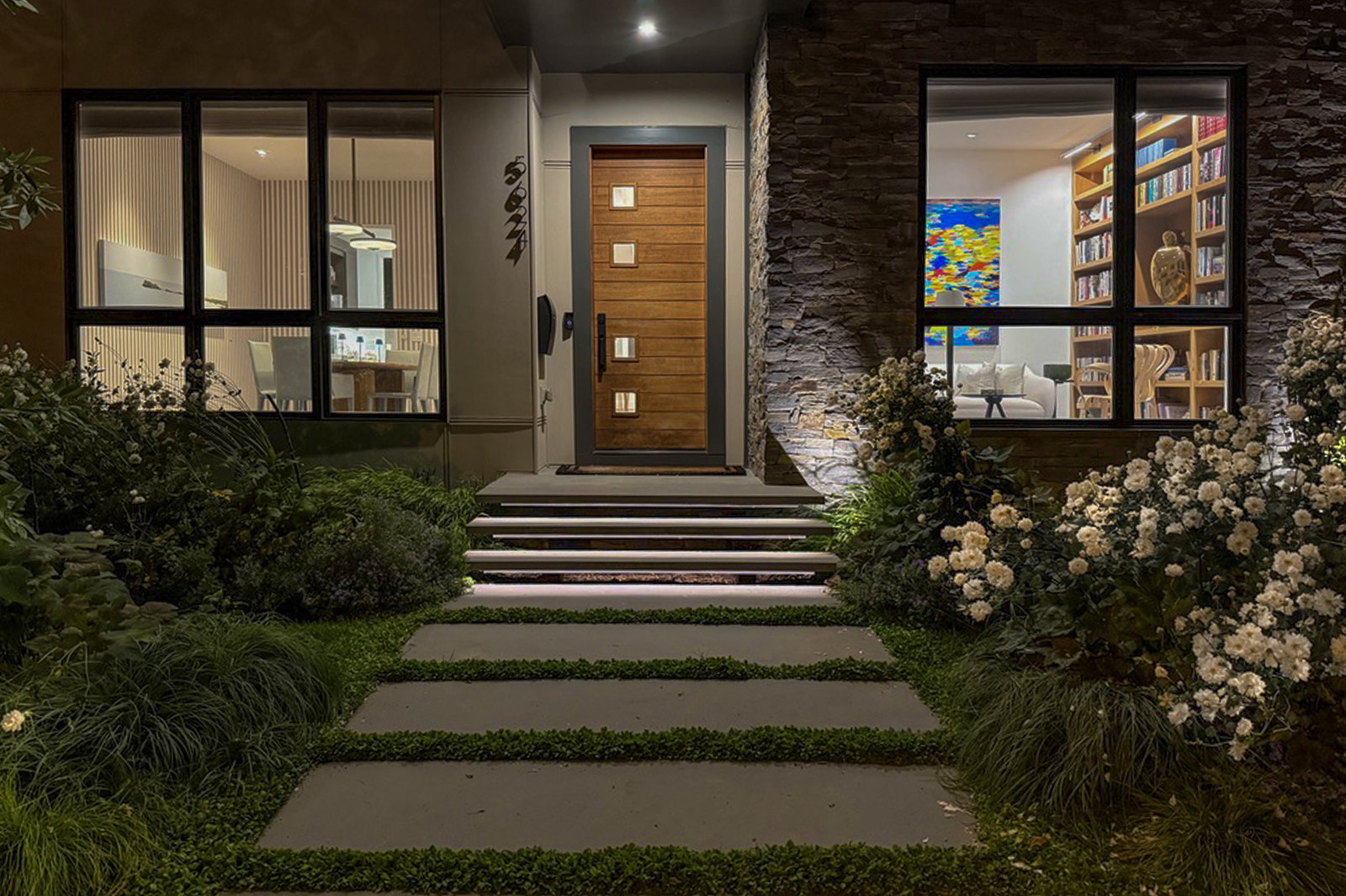 A Modern Masterpiece in the Heart of the Palisades. This exceptional 6-bedroom, 5.5-bathroom residence offers 5,150 square feet of meticulously designed living space across four levels. Built in 2019 by local builder Bo-Bud, the home boasts a striking blend of natural stone and wood paneling, creating a contemporary aesthetic that is both inviting and sophisticated. Floor-to-ceiling windows flood the interiors with natural light, enhancing the open-concept layout and highlighting the home's luxurious finishes.