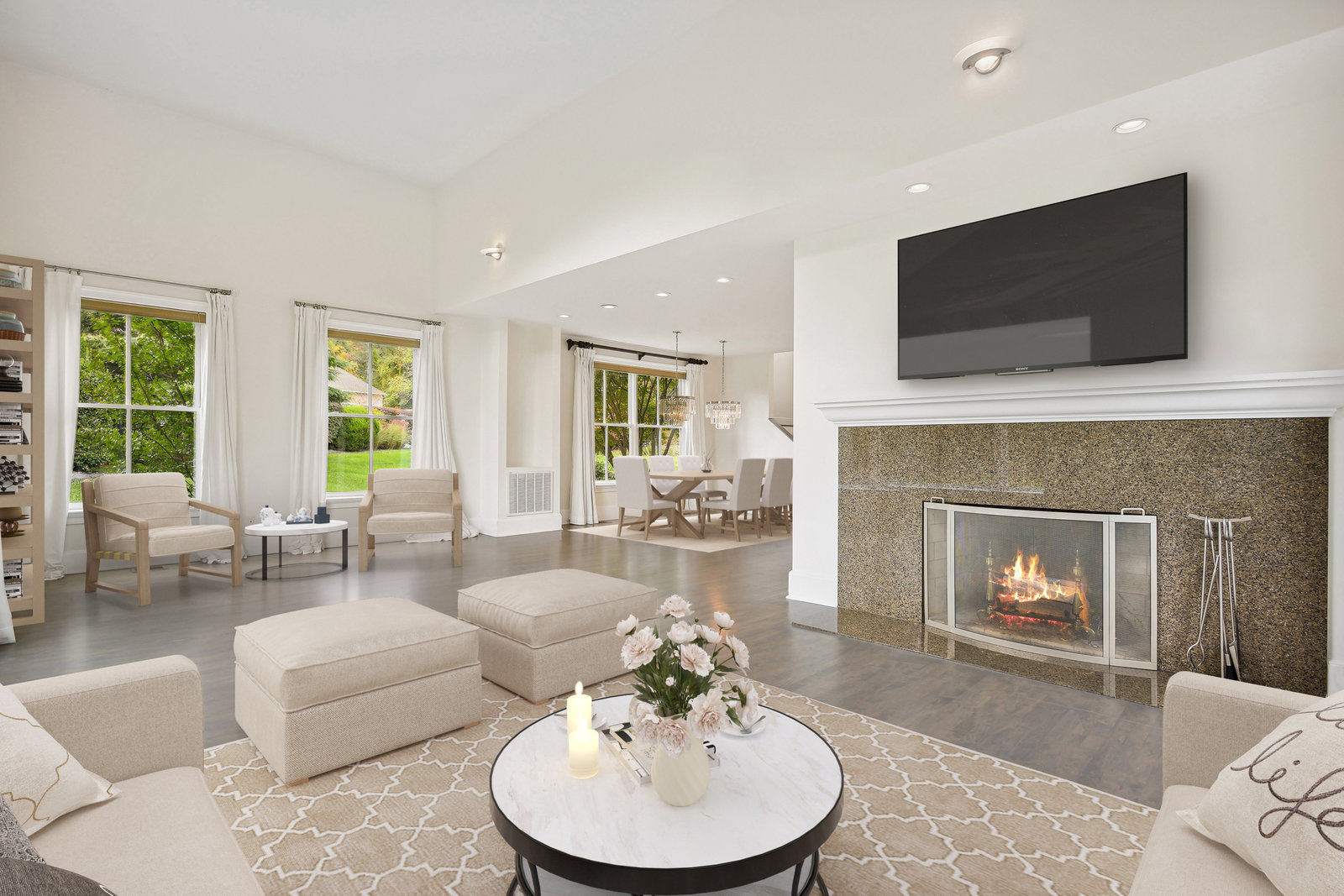 A grand two-story foyer with stately columns and a brick front walk welcomes guests in style. The turreted room off the entry offers flexibility as an elegant office or salon. French doors open to the brick patio, seamlessly connecting indoor and outdoor entertaining, while the living room is anchored by a striking granite fireplace.