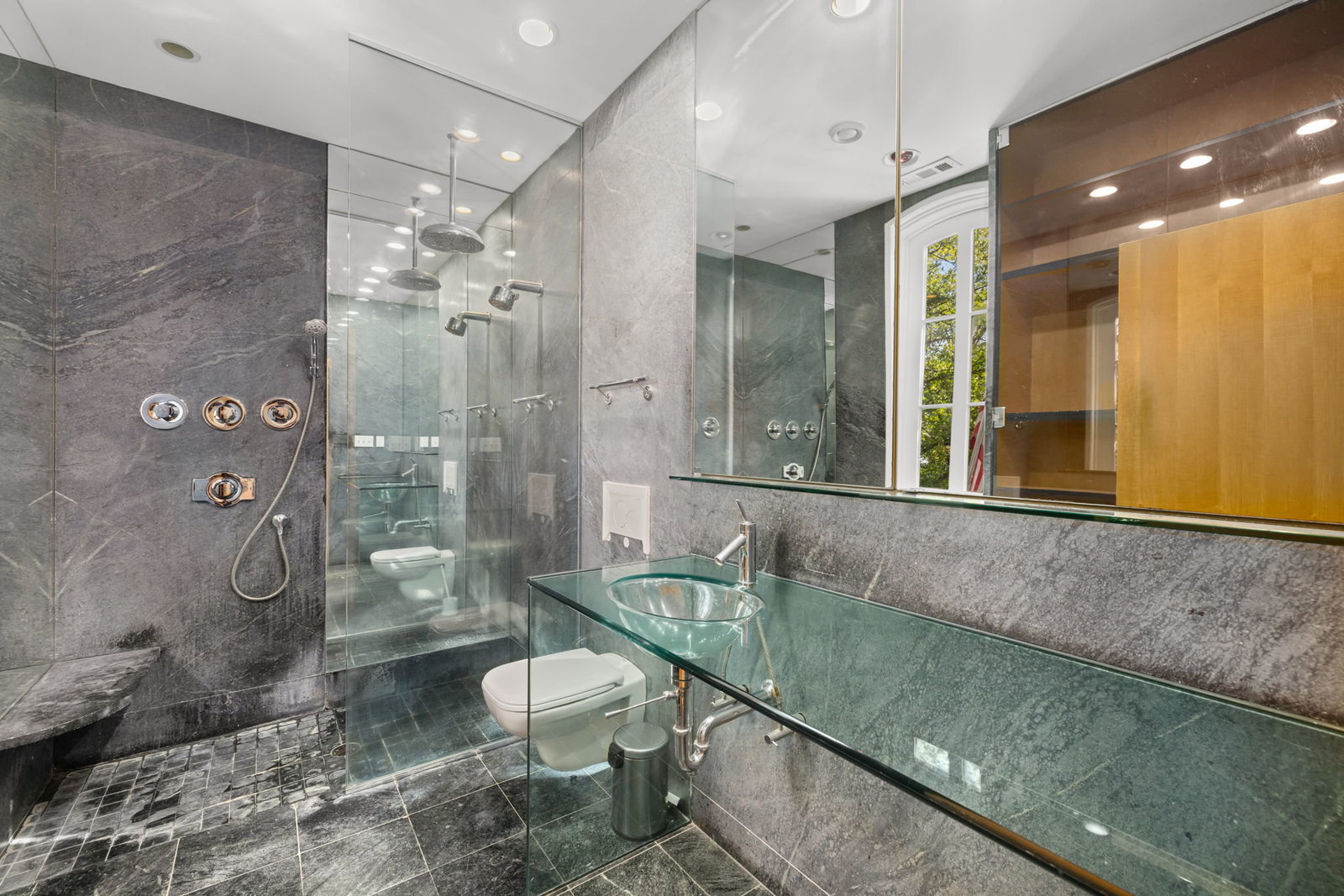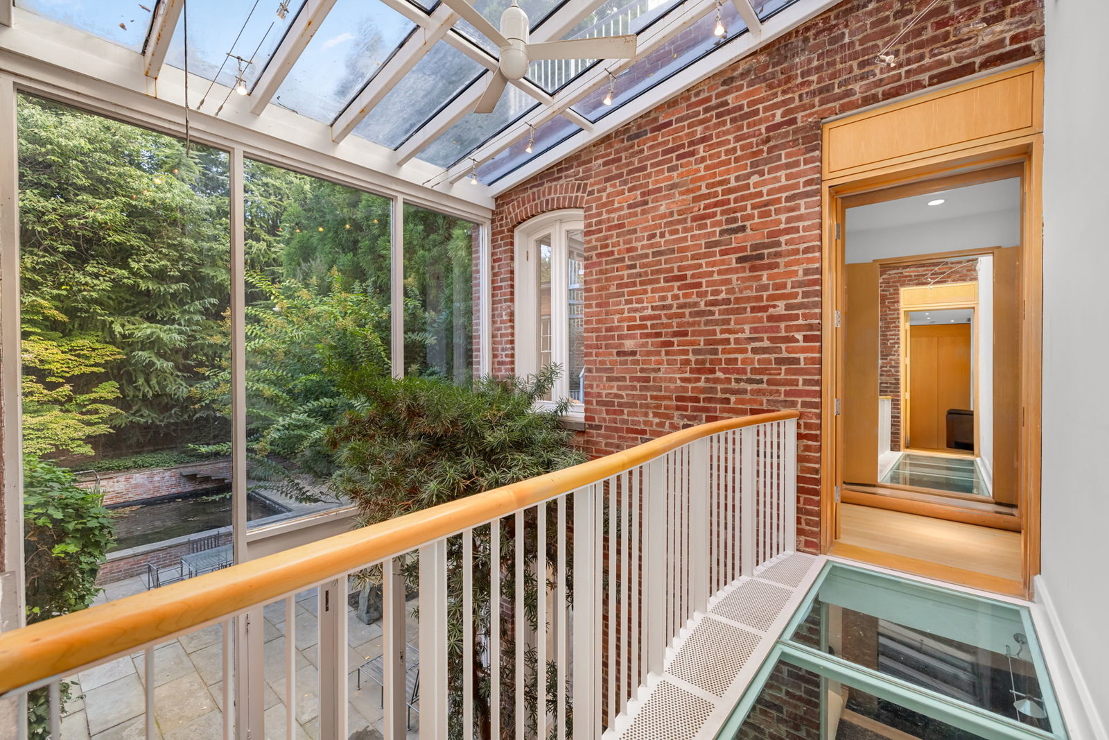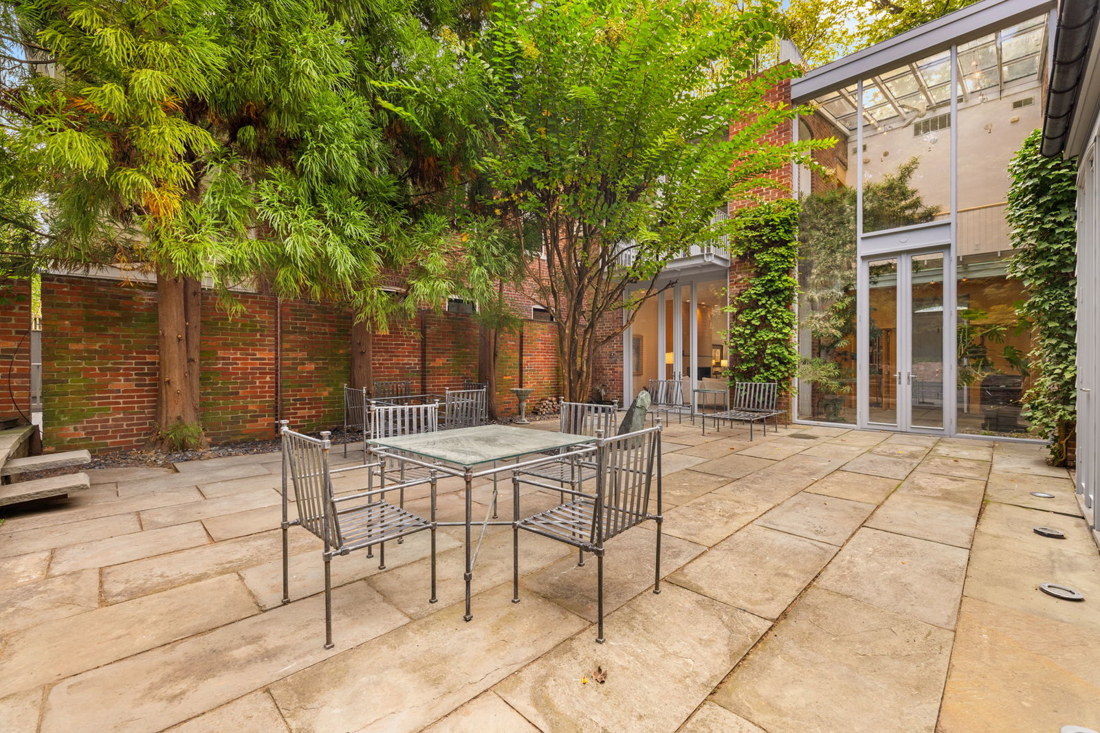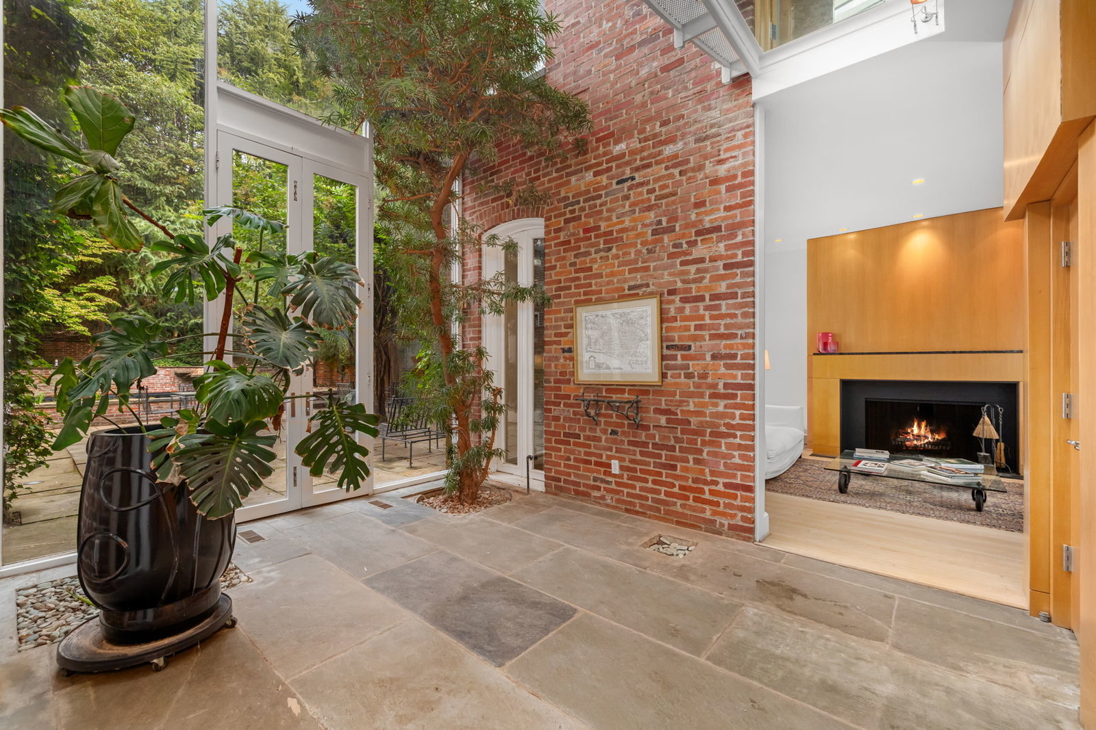 A double set of entry doors opens to a two-story atrium more than twenty feet high, capped by glass ceilings and framed by tall doors to the garden and public rooms. The scale accommodates full trees indoors, while a discreet bar and deep coat closet are built in seamlessly and are hiding in plain sight. To the right, the expansive living room with massive fireplace features a south-facing bay window and glass doors to the garden. On the west side of the atrium, a south-facing library offers large windows, a fireplace, and custom cabinetry. Across the bluestone hallway is a perfectly square dining room with tall connecting doors that creates a singular flow, ideal for entertaining. The immense marble-and-stainless kitchen is filled with light and garden views, it too has a fireplace, and multiple exits to the terrace, and all the practical elements of a true chef’s kitchen. Further down the hall lies the original 1880s staircase, with lower-level stairs and a generous powder room tucked behind them. The lower level provides a lot of dry storage and laundry.