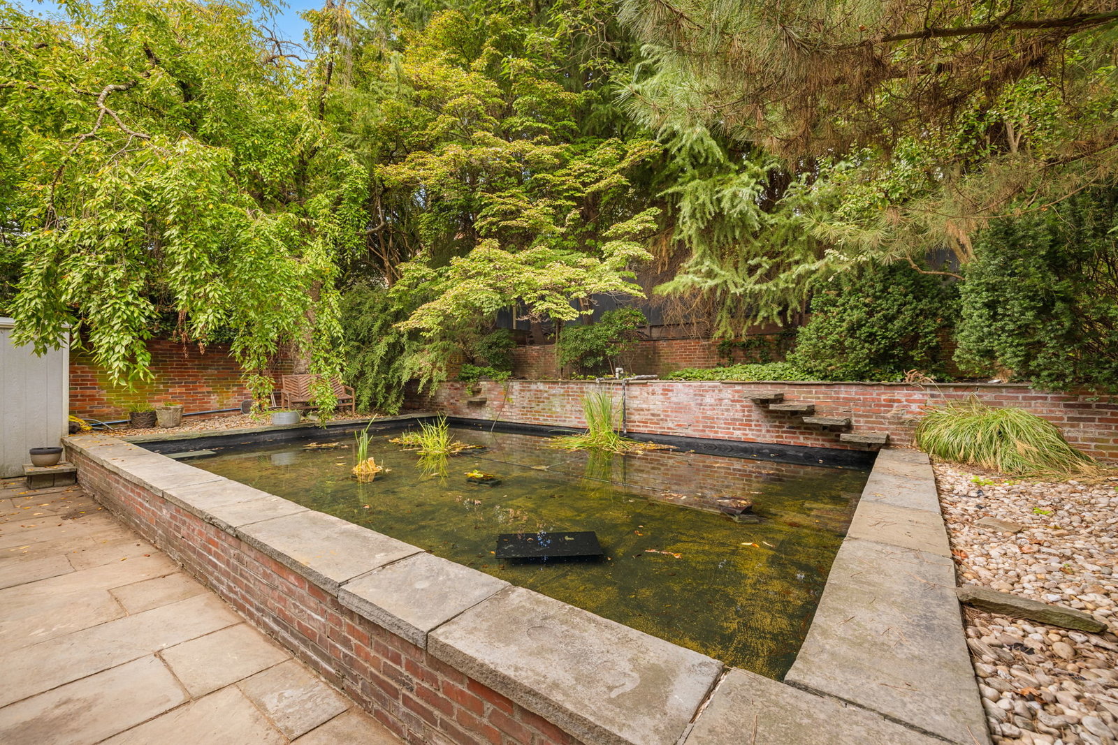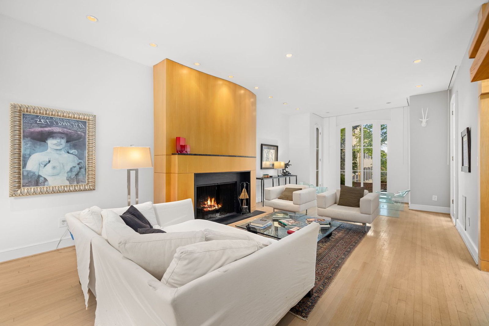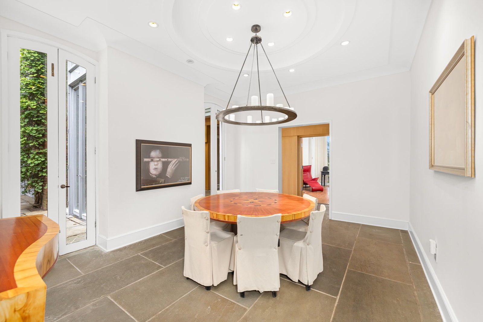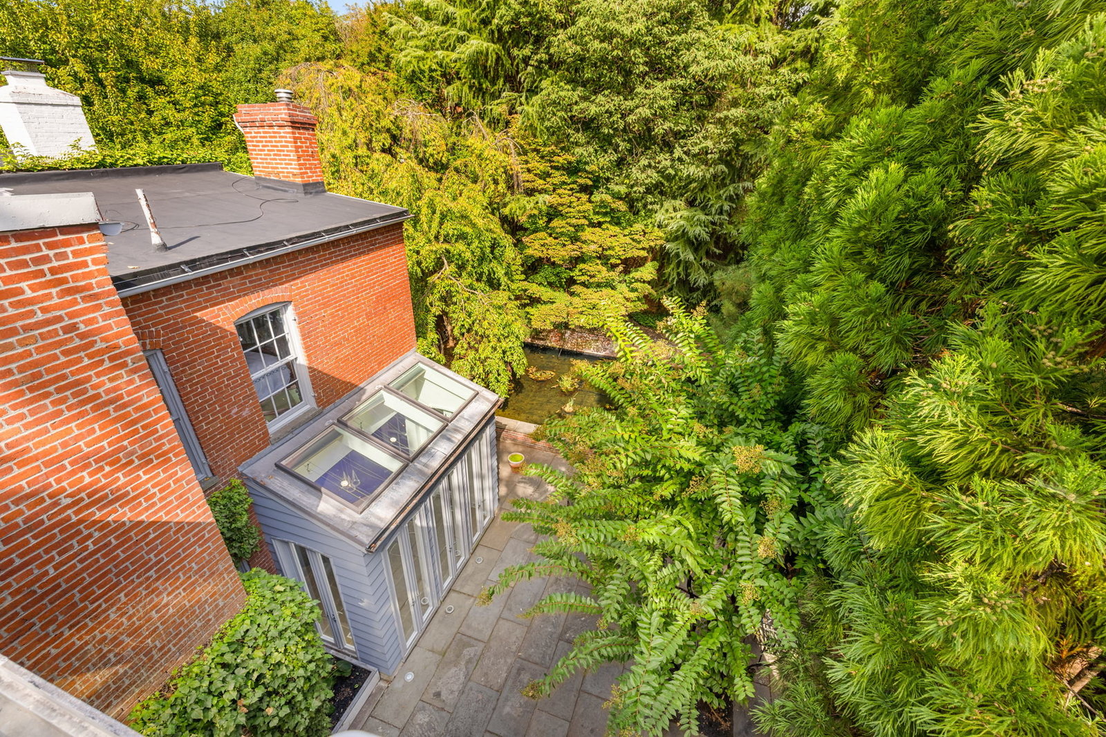 A double set of entry doors opens to a two-story atrium more than twenty feet high, capped by glass ceilings and framed by tall doors to the garden and public rooms. The scale accommodates full trees indoors, while a discreet bar and deep coat closet are built in seamlessly and are hiding in plain sight. To the right, the expansive living room with massive fireplace features a south-facing bay window and glass doors to the garden. On the west side of the atrium, a south-facing library offers large windows, a fireplace, and custom cabinetry. Across the bluestone hallway is a perfectly square dining room with tall connecting doors that creates a singular flow, ideal for entertaining. The immense marble-and-stainless kitchen is filled with light and garden views, it too has a fireplace, and multiple exits to the terrace, and all the practical elements of a true chef’s kitchen. Further down the hall lies the original 1880s staircase, with lower-level stairs and a generous powder room tucked behind them. The lower level provides a lot of dry storage and laundry.
