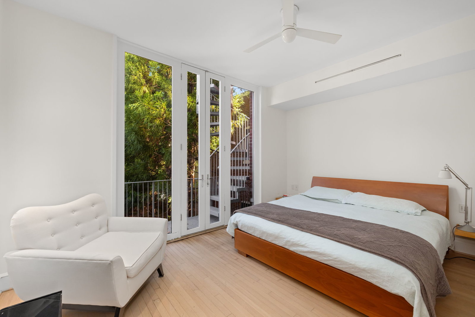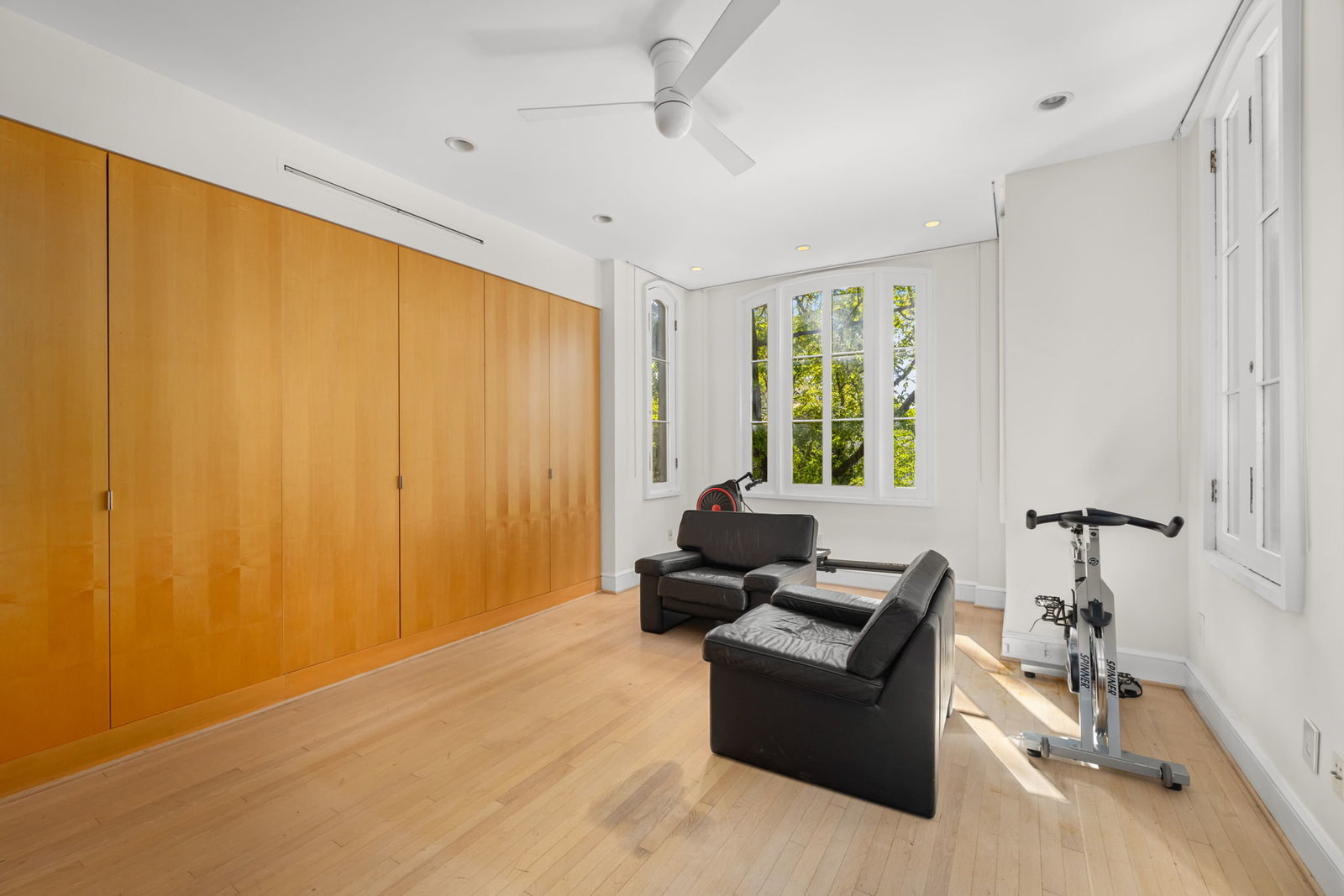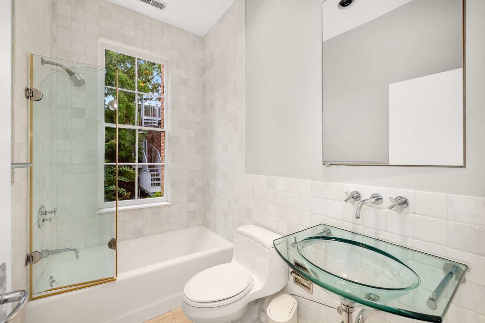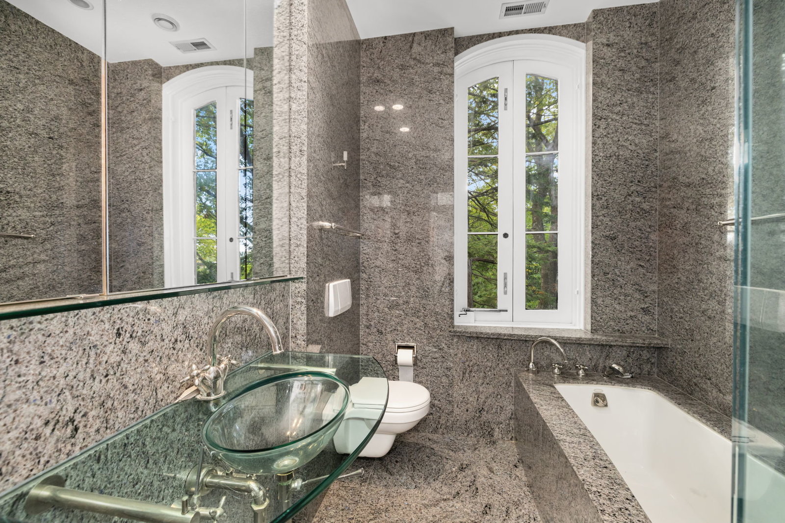A double set of entry doors opens to a two-story atrium more than twenty feet high, capped by glass ceilings and framed by tall doors to the garden and public rooms. The scale accommodates full trees indoors, while a discreet bar and deep coat closet are built in seamlessly and are hiding in plain sight. To the right, the expansive living room with massive fireplace features a south-facing bay window and glass doors to the garden. On the west side of the atrium, a south-facing library offers large windows, a fireplace, and custom cabinetry. Across the bluestone hallway is a perfectly square dining room with tall connecting doors that creates a singular flow, ideal for entertaining. The immense marble-and-stainless kitchen is filled with light and garden views, it too has a fireplace, and multiple exits to the terrace, and all the practical elements of a true chef’s kitchen. Further down the hall lies the original 1880s staircase, with lower-level stairs and a generous powder room tucked behind them. The lower level provides a lot of dry storage and laundry.